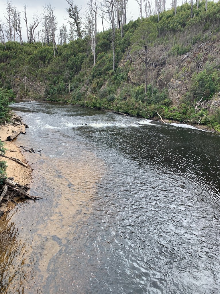 We finally found a small beach to sit for a bit (about the 4km mark). A little boy had his sandwich stolen by a currawong and immediately after, I was attacked by another Cradle Mountain Creature. As I stepped up onto the platform, I thought the currawong was attacking my heels. As I glanced down, I thought it was a python. I can report that I did scream and run on air for a few seconds until reassured by my group. ‘It’s just a stick!’